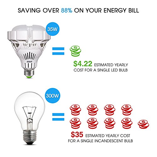 GOOD NEWS--Code “DATEDATE” will drop $6 when purchasing 1 or more. LED Advantages& Energy Efficient--Cut down your electricity bill and extend the lifetime of your bulbs by replacing 300 Watt with LED 35 Watt. Long life service time of 22.8 years (based on 3 hrs/day) ensures no need to change bulbs frequently. Saving over 88% ($200) on your energy bill.