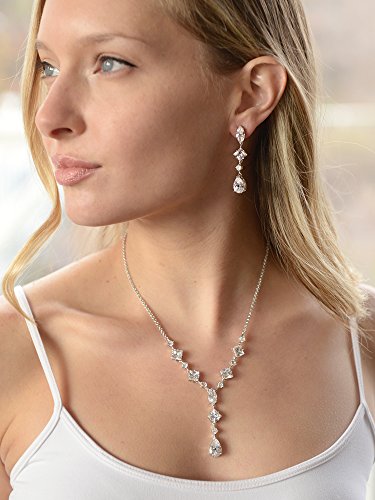 Mariell's exquisite Wedding Necklace and Earrings set features a mix of pears, rounds, marquise and princess cut Cubic Zirconia stones. This glamorous bridal jewelry is guaranteed to turn heads at any special event! Seeking a fresh, contemporary wedding or high fashion special event showpiece? This set is the one! The necklace is adjustable 16" - 19" and plunges 2" at the center. The dangle earrings are 2" h. Treat yourself or someone you love to some seriously gorgeous sparkle.