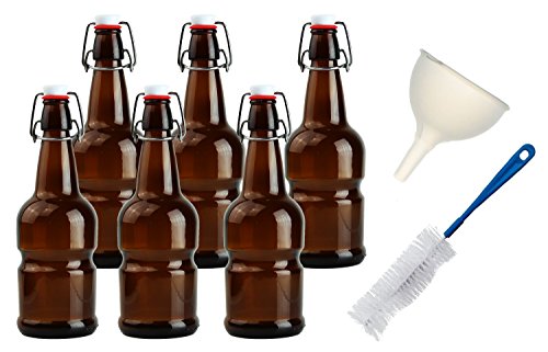 Package: 6 Refillable Amber Glass Beer Bottles that are 16 ounces each, as well as a bottle brush, funnel kit
