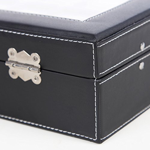 -. Feature : TOP-NOTCH CRAFT -- Made of quality black faux leather and soft gray velvet, this watch box is superexcellent to protect your beloved watches from scratch and damage / 24 SLOTS WATCH DISPLAY CASE -- enough space with 24 removable velvet pillows, wonderful gift choice and home jewelry decoration / LARGE REAL GLASS LID -- Real glass lid keeps your watches from dust, and offers you an open view of the displayed watches / METAL HINGE & LOCK -- The lid has a metal hinge attached to keep it from falling back. Metal lock with keys makes sure of safety / MULTI-FUNCTIONAL COMPARTMENT -- Suit for watches, hairpin, cuff links, brooches, and other stuff