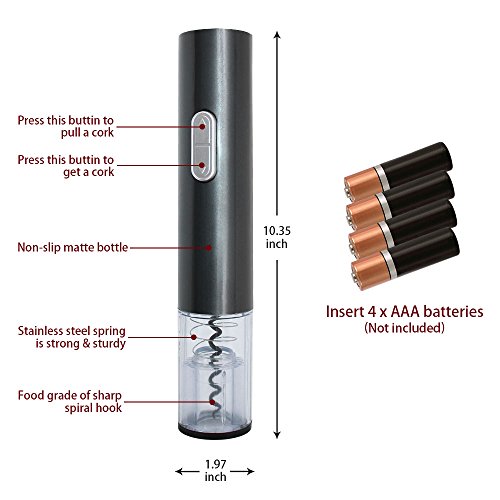 1. Use the handy foil cutter to remove any foil seal covering the cork before removing the cork 2.Put on either 4 AA rechargeable batteries or 4 AA common batteries (not included) before using the wine opener 3.Place the wine opener on top of a wine bottle vertically 4.Simply press the lower button to start. The corkscrew spiral will turn to enter the cork, then it will gradually remove the cork from the bottle, stopping once the cork has been fully removed from the bottle 5. Lift the electric wine bottle opener away from the bottle, and remove the cork by pressing the upper part of the switch--the spiral turns in the opposite direction to release the cork.