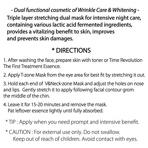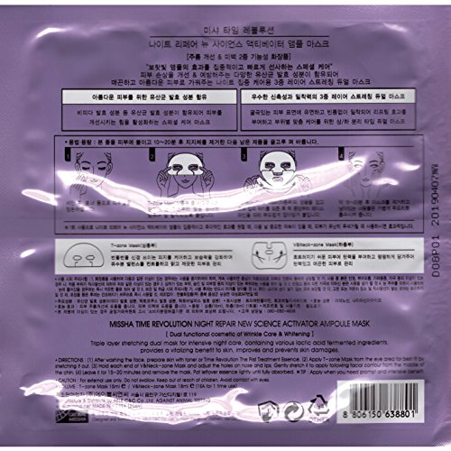 -. Binding : Misc. -. Brand : MISSHA -. EAN : 8806185742955 -. Feature : ** MISSHA Time Revolution Night Repair New Science Activator Ampoule Mask - 3 Masks / Triple layer stretching dual mask for intensive night care, containing various lactic acid fermented ingredients, provides a vitalizing benefit to skin, improves and prevents skin damages. / 1. After washing the face, prepare skin with toner or Time Revolution The First Treatment Essence. 2. Apply T-zone Mask from the eye area for best fit by stretching it out. 3. Hold each end of V&Neck-zone Mask and adjust the holes on nose and lips. Gently stretch it to apply following facial contour grom the middle of the chin. 4. Leave it for 15-20 minutes and remove the mask. Pat leftover essence lightly until fully absorbed. / * TIP : Apply when you need prompt and intensive benefit. -. IsAdultProduct : 0 -. Label : MISSHA -. Manufacturer : MISSHA -. MPN : B01J6Y9OMA -. PackageQuantity : 1 -. PartNumber : B01J6Y9OMA -. ProductGroup : Beauty -. ProductTypeName : BEAUTY -. Publisher : MISSHA -. Studio : MISSHA -. Title : MISSHA Time Revolution Night Repair New Science Activator Ampoule Mask - 3 Masks