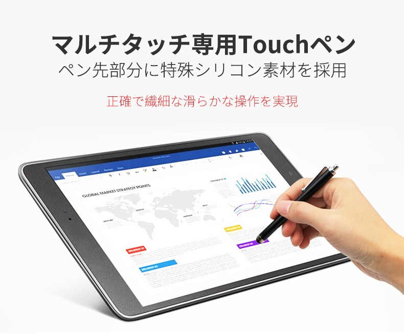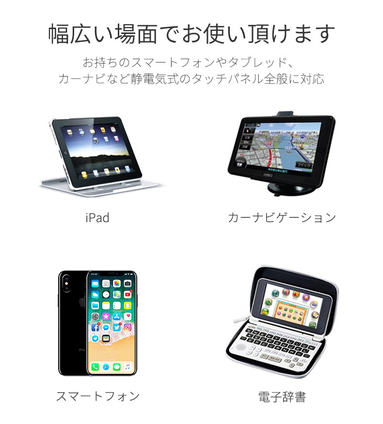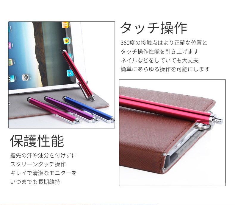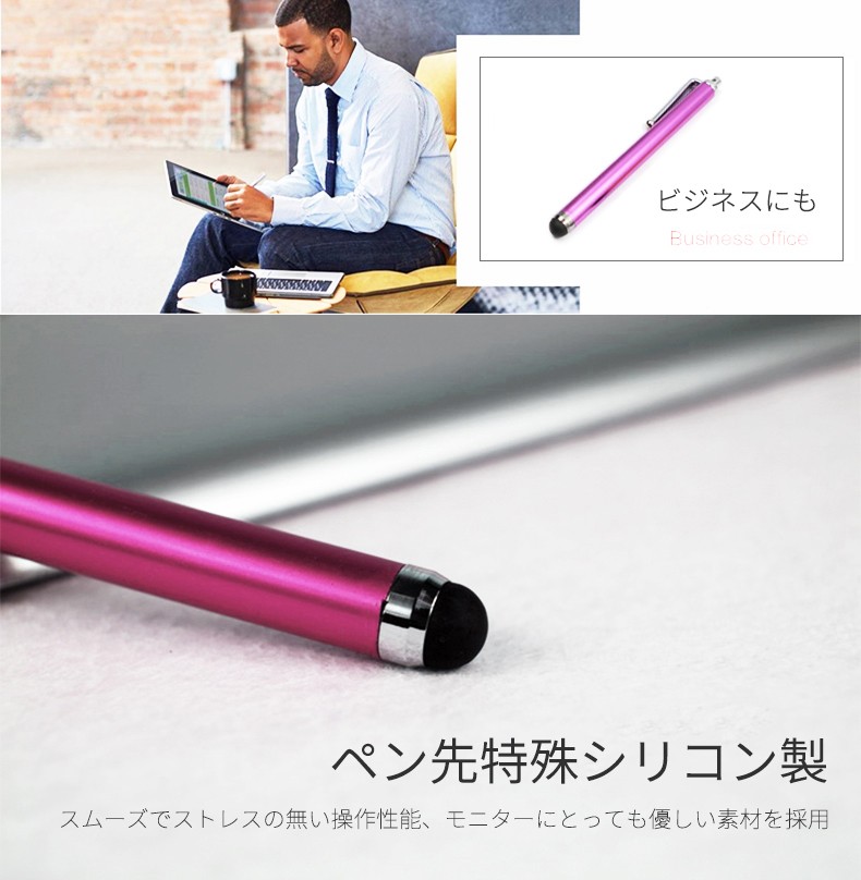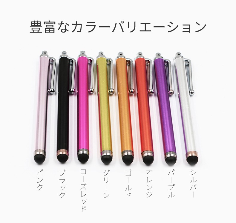 カラー・ピンク・ブラック・ローズレッド・グリーン・ゴールド・オレンジ・パープル・シルバー【 繊細な操作やお絵かきに 】静電容量式のタッチパネルに対応しているタッチペンです。フリック入力や手書き入力、イラスト作成に大活躍柔らかな特殊シリコン素材を使用しているため、ディスプレイを傷つけず、滑らかな操作を実現 【 幅広い利用範囲 】ほとんどのスマートフォン、タブレットゲーム機にも使われている静電容量式タッチディスプレイでご利用可能ストラップホールやクリップもついており、紛失防止や持ち運びに便利豊富なカラーバリエーションを取り揃えているので、複数買って気分によって使い分けも!
