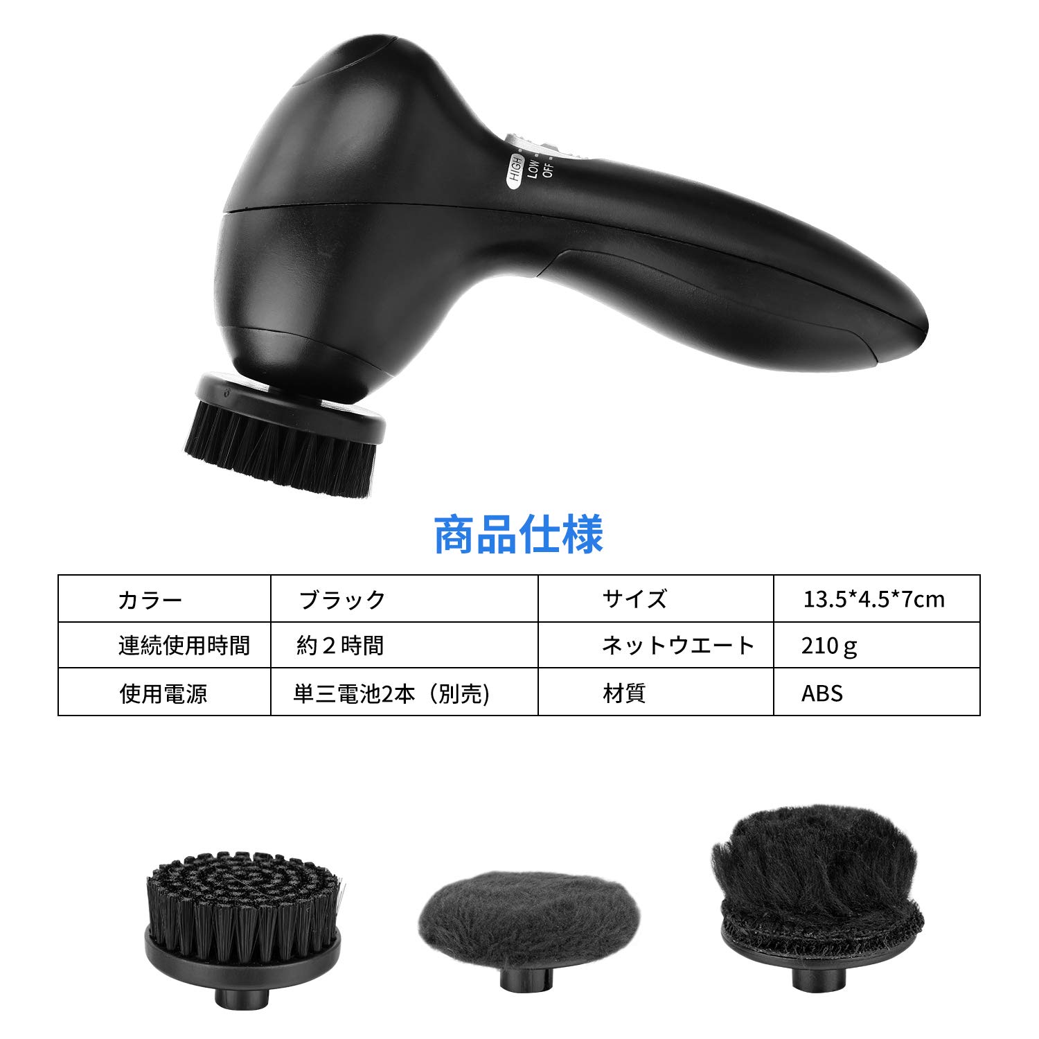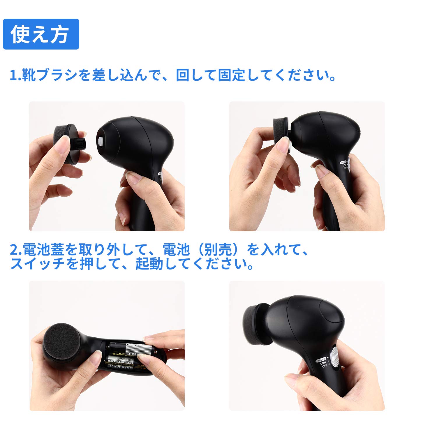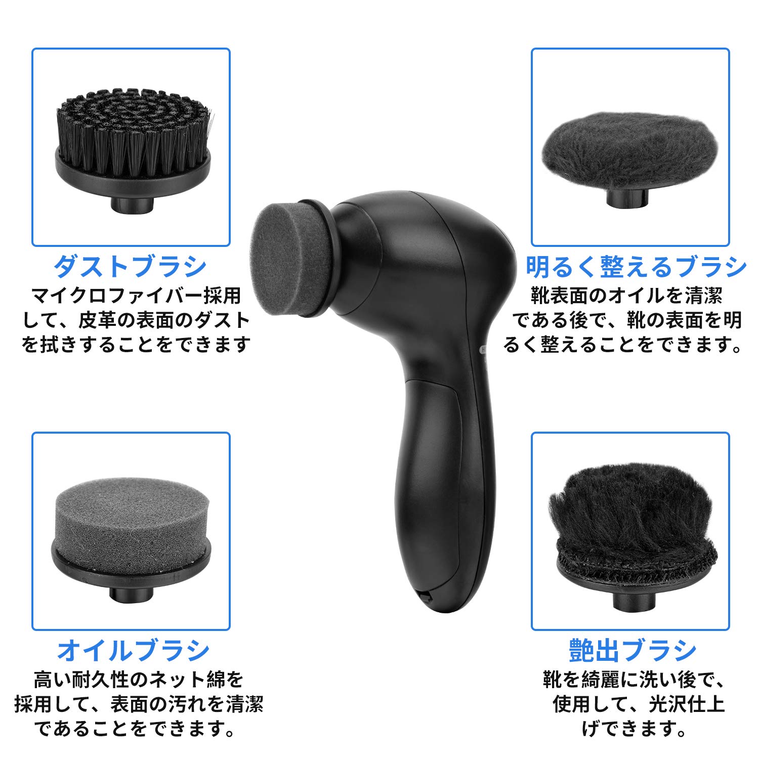 「四つのヘッド付き」:ダストブラシ、明るく整えるブラシ、オイルブラシと艶出ブラシという四つのブラシを使い分けできます。自身の需要によって、ブラシヘッドを気軽に変換することができます。靴に付いたホコリや汚れの洗浄、靴の研磨、靴の輝きなどを手軽にできます。