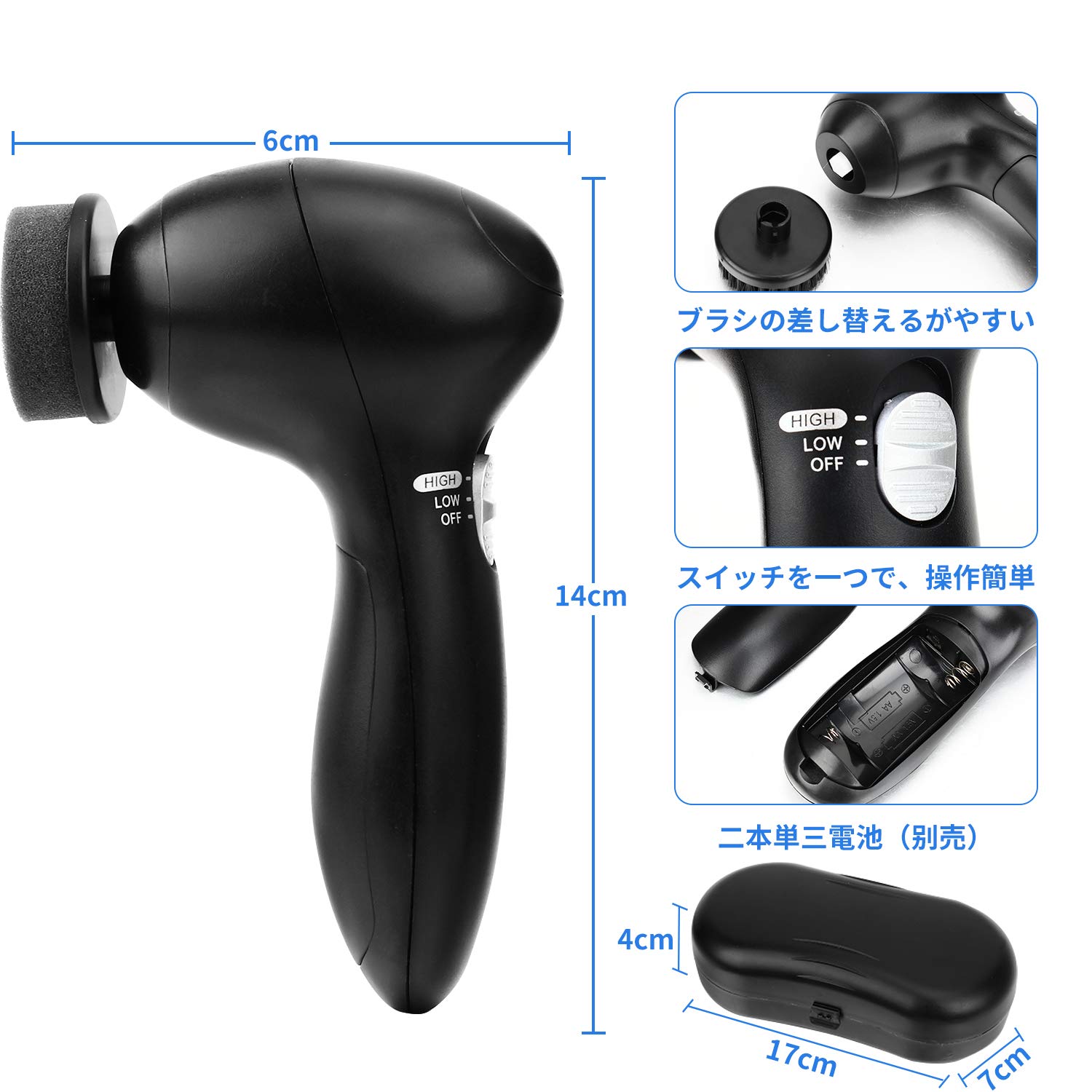 「持ち運びに便利」:13.5*4.5*7cmのコンパクトのサイズ、手が小さい方も持ちやすいです。凹凸ハンドルの設計で、手持ちが良いです。収納ボックス付きので、出勤、旅行など外に出かけると、2本の単三電池に入れて、いつでも使用できます。持ち運びにとても便利の電動靴磨き機です。