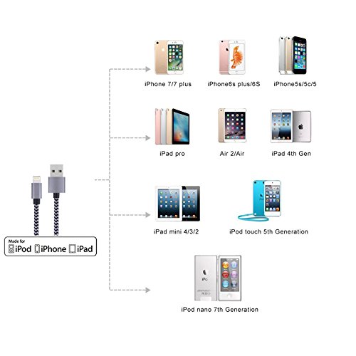 ★ Compatibility: complete charge and sync compatibility with iPhone 7 / 6s / 6s+ / 6 / 6+ / SE / 5s / 5c / 5, iPad Air / Air 2 / Pro, iPad mini / mini 2 / mini 3 / mini 4, iPad (4th generation), iPod nano (7th generation) and iPod touch (5th generation)
