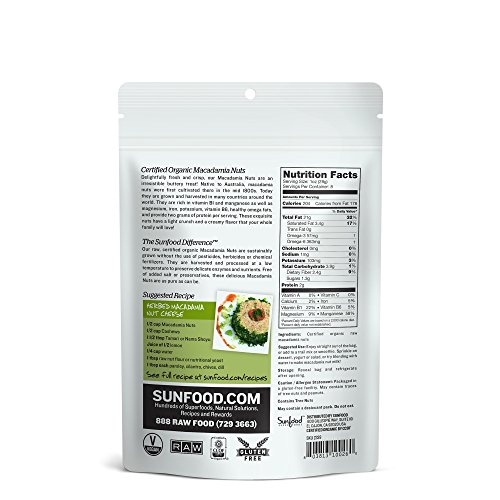 -. Feature : Contains:Omega 3-6 Brain FunctionMagnesium Heart & BonesVitamin B1 Metabolic StrengthIron Blood Certified Organic Macadamia NutsDelightfully fresh and crisp, macadamia nuts are an irresistible, creamy treat loaded with manganese, magnesium, iron, potassium and calcium / SunFood