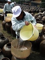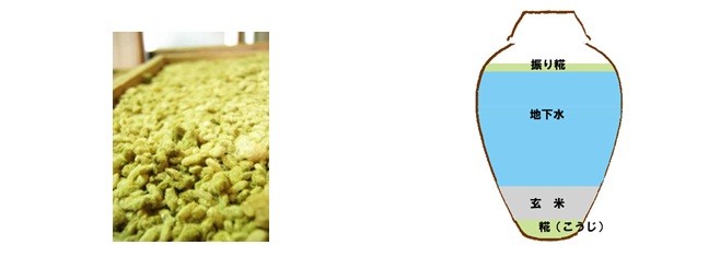 そのプロセスを見ていくと、まず薩摩焼の壺の中に混ぜ麹、蒸し米、地下水の順番で原料を入れ、