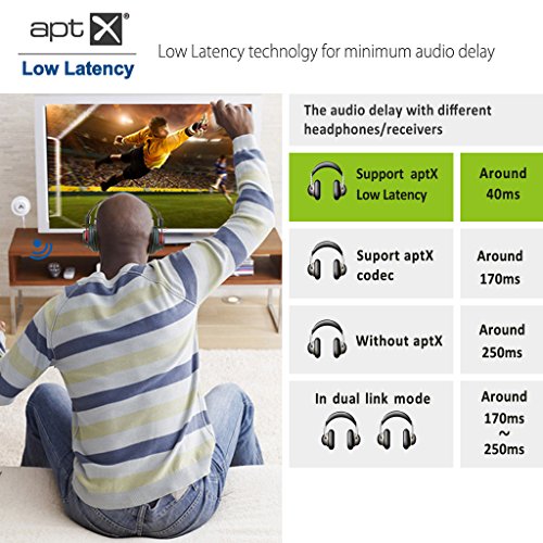 - Feature : Enjoy TV wirelessly with NO AUDIO DELAY, no disturbing others - Leading edge aptX LOW LATENCY Technology. / CHARGE FREE, so Worry Free - use TV power via USB OR use build in battery for portability. / Stream TV Audio to TWO RECEIVERS (headphones, speakers) simultaneously. / Portability - Share audio with friends outdoor. / Amazing BUNDLE DEALS for Frequent buy together items.