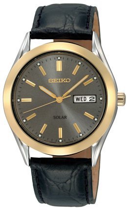 Studio : Seiko Publisher : Seiko Binding : Watch Product Description Powered by light, this watch will never need a battery change. . . . . Gray dial with gold-tone hands and markers . . Two-tone case . . Black leather strap features a tang buckle . . Solar: no battery change required, powered by all types of light . . Full charge under fluorescent light: 175 hours . . Full charge under normal sunlight: 9 hours . . 10 month power reserve with full charge under light . . Day-date window at the 3 position . . Hardlex mineral crystal . . Water resistant to 30 meters (100 feet) . . Case width 36mm (approximately 1 3/8 inches) . .