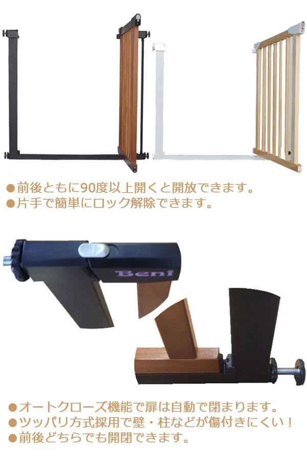 オートクローズ機能付きの扉は前後どちらにも開閉できて、ロックも片手で解除できるので開け閉めが簡単!!扉を90度以上開けば開放しておくこともできます。 |