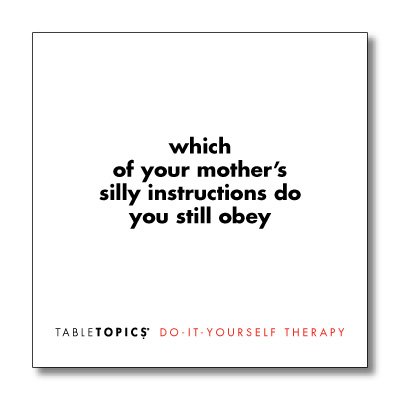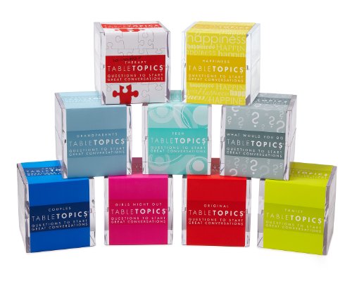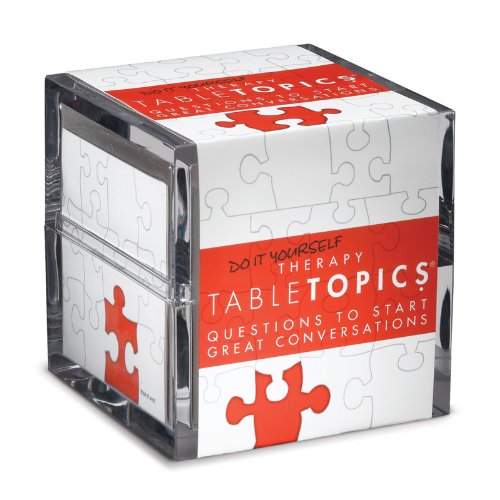 -. Binding : Toy -. Brand : TableTopics -. Color : red and white -. EAN : 0882295001814 -. Feature : With more than 2 million copies sold, TableTopics are the #1 best-selling conversation starters / Lively and playful questions designed to help friends get down to what makes them tick, twitch and laugh at themselves / Fun way to learn more about yourself, your friends and family / Ages 12 and up, 135 questions in a beautiful 4-inch acrylic cube -. IsAdultProduct : 0 -. Label : TableTopics -. Manufacturer : TableTopics -. Model : TT-0127-A -. MPN : TT-0127-A -. PackageQuantity : 1 -. PartNumber : TT-0127-A -. ProductGroup : Toy -. ProductTypeName : TOYS_AND_GAMES -. Publisher : TableTopics -. Studio : TableTopics -. Title : TABLETOPICS Do It Yourself Therapy: Questions to Start Great Conversations -. UPC : 882295001814