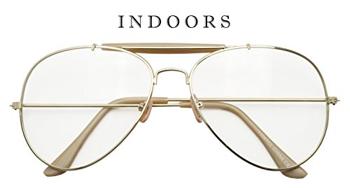 New and improved iconic aviators are and will forever continue to be an everlasting style. Combined with a classy and hip updated full thin metal frame, a stylish dual bridge bar, and a standard fit. They carry transition lenses making them perfect for an all day wear. Wear them indoors as your fashionable clear lens and as sunglasses when outside. These retro glasses will convert into dark lens sunglasses all on their own when exposed to UV sunlight. When they are no longer exposed to the effect of UV light, the lenses will return to their clear lens state. No need to take them off or switch to dark lens glasses when enjoying your day out. So make sure to add these classics to your year round eye wear collection. They are made with English style nose pieces, exposed metal hinges, and photochromic UV400 protected lenses.Feature
