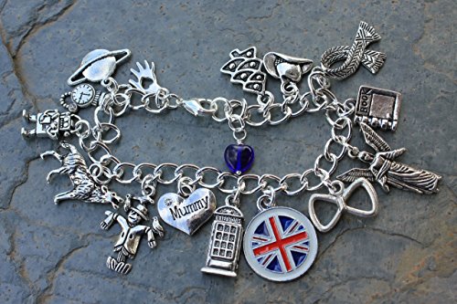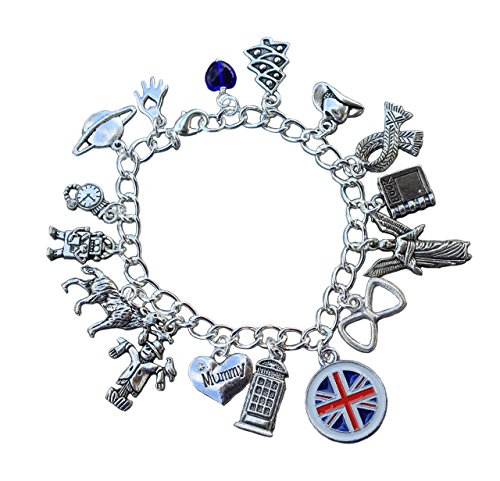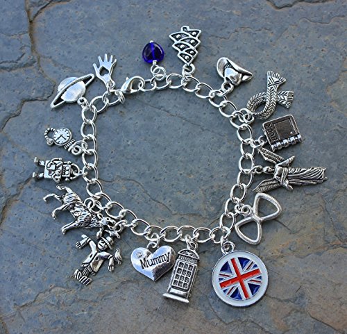 -. Feature : 16 pewter and zinc alloy charms. Charms range from 1/2" to 1" tall. Chunky silver plated bracelet chain & lobster clasp. / Handmade in the USA by Night Owl Jewelry / Available in size XS (6.5"), S (7"), M (7.5"), L (8"), XL (8.5") - PICK SIZE FROM LENGTH PULL DOWN MENU / Charms: hand, planet, pocket watch, evil robot (a little cuter than the real ones), bad wolf, scarecrow, mummy heart / Charms: Police Box, Union Jack, bow tie, angel, diary, scarf, cowboy hat, Christmas tree & blue glass heart