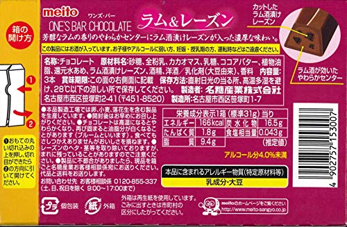 原材料:砂糖、全粉乳、カカオマス、乳糖、ココアバター、植物油脂、還元水あめ、ラム酒漬けレーズン、酒精、洋酒/乳化剤(大豆由来)、香料