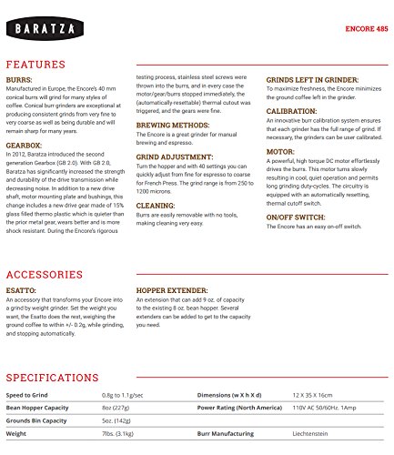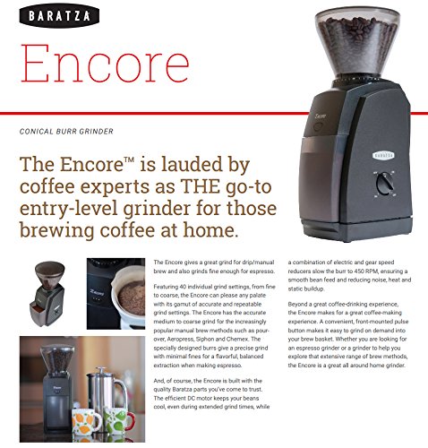 Baratza Encore 485 Conical Burr Coffee Grinder - Burrs: Manufactured in Europe, the Encore's 40 mm conical burrs will grind for many styles of coffee. Conical burrs grinders are exceptional at producing consistent grinds from very fine to very coarse as well as being durable and will remain sharp for many years. Gearbox: In 2012, Baratza introduced the second generation Gearbox (GB 2.0). With GB 2.0, Baratza has significantly increased the strength and durability of the drive transmission while decreasing noise. Grind Adjustment: Turn the hopper and with 40 settings you can quickly adjust from fine for espresso to coarse for French Press. The grind range is from 250 to 1200 microns. Grinds Left in Grinder: To maximize freshness, the Encore minimizes the ground coffee left in the grinder. Brewing Methods: The Encore is a great grinder for manual brewing and espresso. Motor: A powerful, high torque DC motor effortlessly drives the burrs. This motor turns slowly resulting in cool, quiet operation and permits long grinding duty-cycles. The circuitry is equipped with an automatically resetting, thermal cutoff switch. Calibration: An innovative burr calibration system ensures that each grinder has the full range of grind. If necessary, the grinders can be user calibrated. Speed Control: With unique speed control, the Encore uses a combination of gear and electronic speed reduction to control the rotation of the burr to 450 RPM. The electronic speed controller is adjustable from 405 to 495 RPM in the event that specific user conditions require modification of the speed. This slow speed reduces heat, noise, and static generation in the grinder. -- (US 100-120V for use within the USA.) >>> Zonoz One-Tablespoon Plastic Clever Scoop >>> Brushtech Coffee Grinder Dusting Brush (B00L4SGOHU) - Efficiently cleans out leftover, stale grounds and coffee powder. To ensure coffee flavor at its freshest, clean with our marvelous dusting brush.Feature