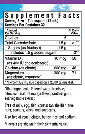 This naturally delicious orange flavored liquid contains a combination of Calcium, Magnesium and Vitamin D3