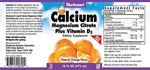 Bluebonnet's Liquid Calcium Magnesium Citrate Plus Vitamin D3 provides calcium in a chelate of calcium citrate (600 mg), as well as magnesium (300 mg) in a chelate of magnesium citrate and magnesium aspartate. Plus, this formula contains vitamin D3 (cholecalciferol) (400 IU) from natural lanolin. Available in an easy-to-swallow liquid form with naturally delicious fruit flavors for maximum assimilation and absorption.Feature