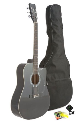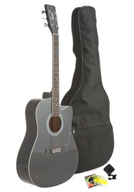 Studio : Fever Publisher : Fever Binding : Electronics Product Description The Fever Dreadnought Cutaway Acoustic Guitar is an ideal instrument for the beginner/intermediate, or young musician. This is a full size 41-Inch guitar body depth and width that brings out balanced tone and plenty of projection to be heard from across the room. The rosewood bridge and fretboard add clarity to each note, and a striking look to the front of the guitar, it has 20 frets and Cutaway design to allow you reach higher notes. This Fever Guitar features nickel hardware and tuners. The guitar includes a protective Acoustic Guitar Gig Bag, a Clip on Chromatic Guitar Tuner and a Set of Guitar Strings. This affordable dreadnought acoustic guitar will certainly get the job done, at a price that anybody can afford. 0