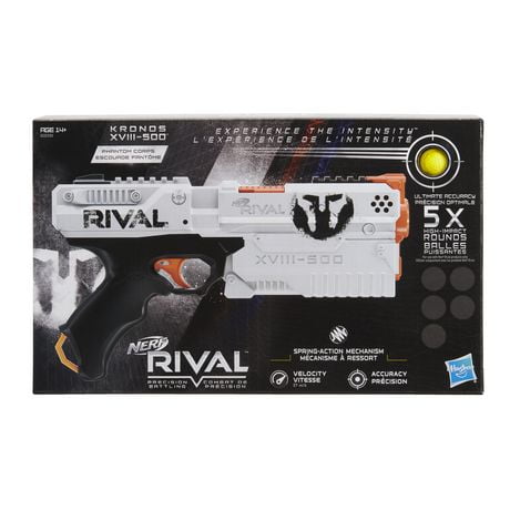 -- Phantom Corps is a group of rogue specialists who may join Team Red or Team Blue today, then challenge them tomorrow. Nerf Rival battles will never be the same! Go into battle as a member of the Phantom Corps team with the breech-loading Kronos XVIII-500 blaster that features the team’s identifying color and logo. Open the breech to load 5 high-impact rounds into the blaster, then prime it with the spring-action cocking mechanism, take aim, and fire! The blaster sends the rounds blasting into battle at 90 feet per second (27 meters per second). This Nerf Rival blaster also has a trigger lock, and tactical rail. It comes with red and blue flags that players can wear whenever they choose to join Team Red or Team Blue. Experience the intensity of Nerf Rival with the Nerf Rival Phantom Corps Kronos XVIII-500 blaster!