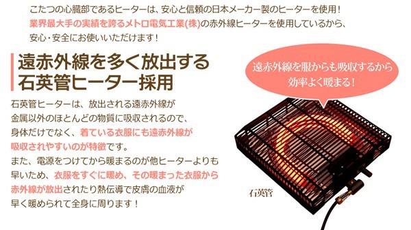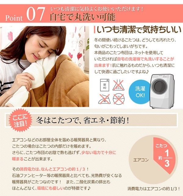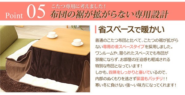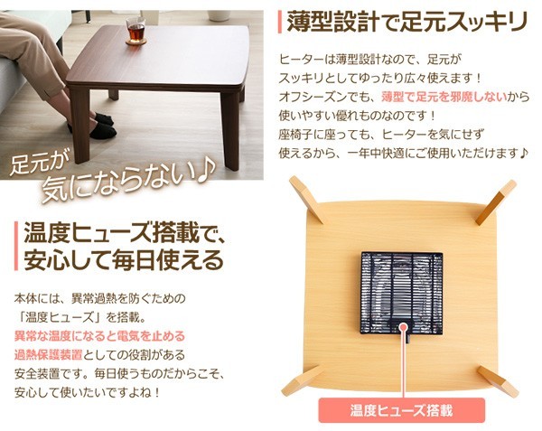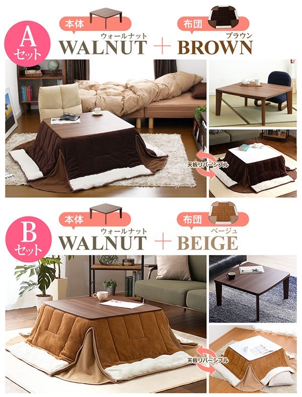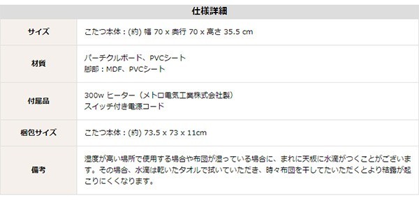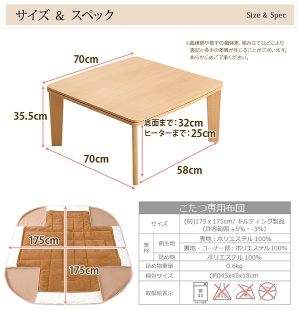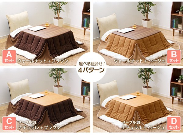 【商品について】カジュアルこたつ【-Topo-トーポ(正方形・70cm幅)】(こたつテーブル+掛布団の2点セット)■サイズ:本体外寸:(約)幅70x奥行70x高さ35.5cm(約)11.74kg布団:(約)幅175x奥行175cm(約)1.7kg■カラー:(Aセット)(Bセット)(Cセット)(Dセット)■素材:天板:パーチクルボード、PVCシート脚:MDF、PVCシート※付属品:300Wヒーター(メトロ電気工業株式会社製)・無段階温度調節機能、温度ヒューズ付・スイッチ付き電源コード布団:表地、裏地、詰め物:ポリエステル100%※洗濯可能(ネット使用)■その他:・完成品でお届けします。※脚はお客様取付け本体:(約)73.5x73x11cm(約)12.6kg布団:(約)45x45x18cm(約)2.7kg