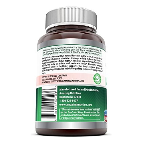 -. Binding : Health and Beauty -. Brand : Amazing Nutrition -. EAN : 0810180021036 -. Feature : WHAT IS MELATONIN Melatonin Is A Hormone That Naturally Occurs In Human Body. It Is Made By The Pineal Gland. Melatonin Circulates Through A Daily Cycle So That There Is A Higher Concentration Of It At Night. At Night, Higher Levels Of Melatonin Is Held By The Body To Induce And Maintain Sleep / NATURAL SLEEP AID Amazing Nutrition Melatonin Tablets Do Not Contain Any Unnecessary Fillers Or Binders, Allowing You To Benefit Fully From Melatonin. The Natural Way To Promote Relaxation And Positive Mood / POTENT DOSE Each Of Our Melatonin Table Has 10mg Of Maximum Strength Melatonin. Making It An Optimum And Effective Dosage / GUARANTEED QUALITY Our melatonin is made in the USA at a GMP certified facility, so you can be certain you're getting only the finest supplement when you choose Amazing Formulas / NO ARTIFICIAL ADDITIVES, PERFECT FOR YOUR HEALTHY DIET Our melatonin supplement is suitable for vegetarian. It is completely free of artificial colors, flavors and sweeteners and contains no preservatives. -. IsAdultProduct : 0 -. Label : Amazing Nutrition -. Manufacturer : Amazing Nutrition -. PackageQuantity : 1 -. ProductGroup : Health and Beauty -. ProductTypeName : HEALTH_PERSONAL_CARE -. Publisher : Amazing Nutrition -. Studio : Amazing Nutrition -. Title : Amazing Nutrition Melatonin - 5 Mg Tablets - Best Choice of Natural Sleep Aid Supplement - Promotes Calming and Relaxing Effect - 180 Pills Per Bottle- Suitable for Vegetarians -. UPC : 810180021036