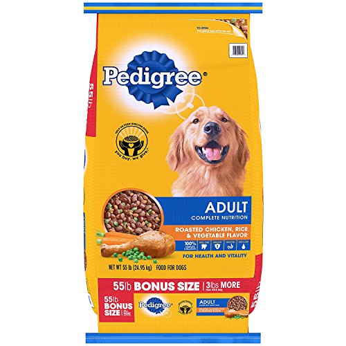 -. Binding : Misc. -. Brand : Pedigree -. EAN : 0023100107318 -. Feature : Contains one (1) 55-lb. bag of PEDIGREE Adult Roasted Chicken, Rice & Vegetable Flavor Dry Dog Food / Our balanced dog food provides optimal levels of omega-6 fatty acid and other nutrients that are essential to nourish your dog's skin and coat / PEDIGREE Food for Dogs features a delicious chicken flavor that keeps dogs begging for more / This adult dog food also contains whole grains and protein and is accented with vegetables / PEDIGREE Dry Dog Food features unique, crunchy kibble to help keep dogs' teeth clean -. Label : Mars Petcare -. Manufacturer : Mars Petcare -. Model : 10112269 -. MPN : 10112269 -. PackageQuantity : 1 -. PartNumber : 10112269 -. ProductGroup : Pet Products -. ProductTypeName : PET_SUPPLIES -. Publisher : Mars Petcare -. Size : 55 lbs. -. Studio : Mars Petcare -. Title : PEDIGREE Adult Roasted Chicken, Rice & Vegetable Flavor Dry Dog Food 55 Pounds -. UPC : 023100107318