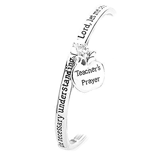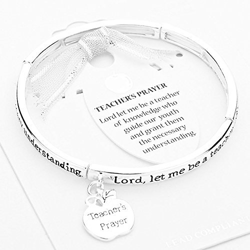 -. Binding : Jewelry -. Brand : Rosemarie Collections -. Department : womens -. Feature : Silver color stretch bangle bracelet for teacher with prayer and apple charm / Packaged in a lovely gift box / Size: Stretch - one size fits all .25" height Beautiful and sentimental engraving, Highly Polished / "Lord let me be a teacher of knowledge who guide our youth and grant them necessary understanding" / Highlight on this Teacher Appreciation bracelet is the engraved prayer and the inscribed book mark included -. ProductGroup : Jewelry -. ProductTypeName : FASHIONNECKLACEBRACELETANKLET -. Title : Teachers Prayer Silver Tone Stretch Bangle Bracelet Apple Charm