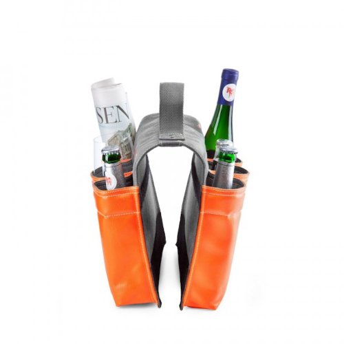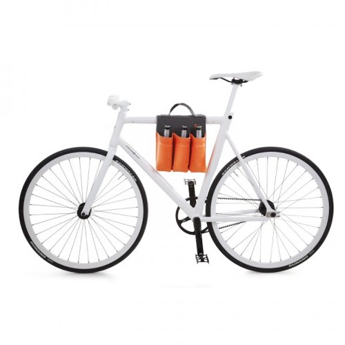 Studio : Donkey Publisher : Donkey Binding : Kitchen Product Description Great bike accessory for your adventures, picnics and football games. This 6-slot Bike bag is a saddle bag with six compartments for carrying up to six bottles; The bag is made of dark grey canvas with black velcro strap and orange plastic exterior.