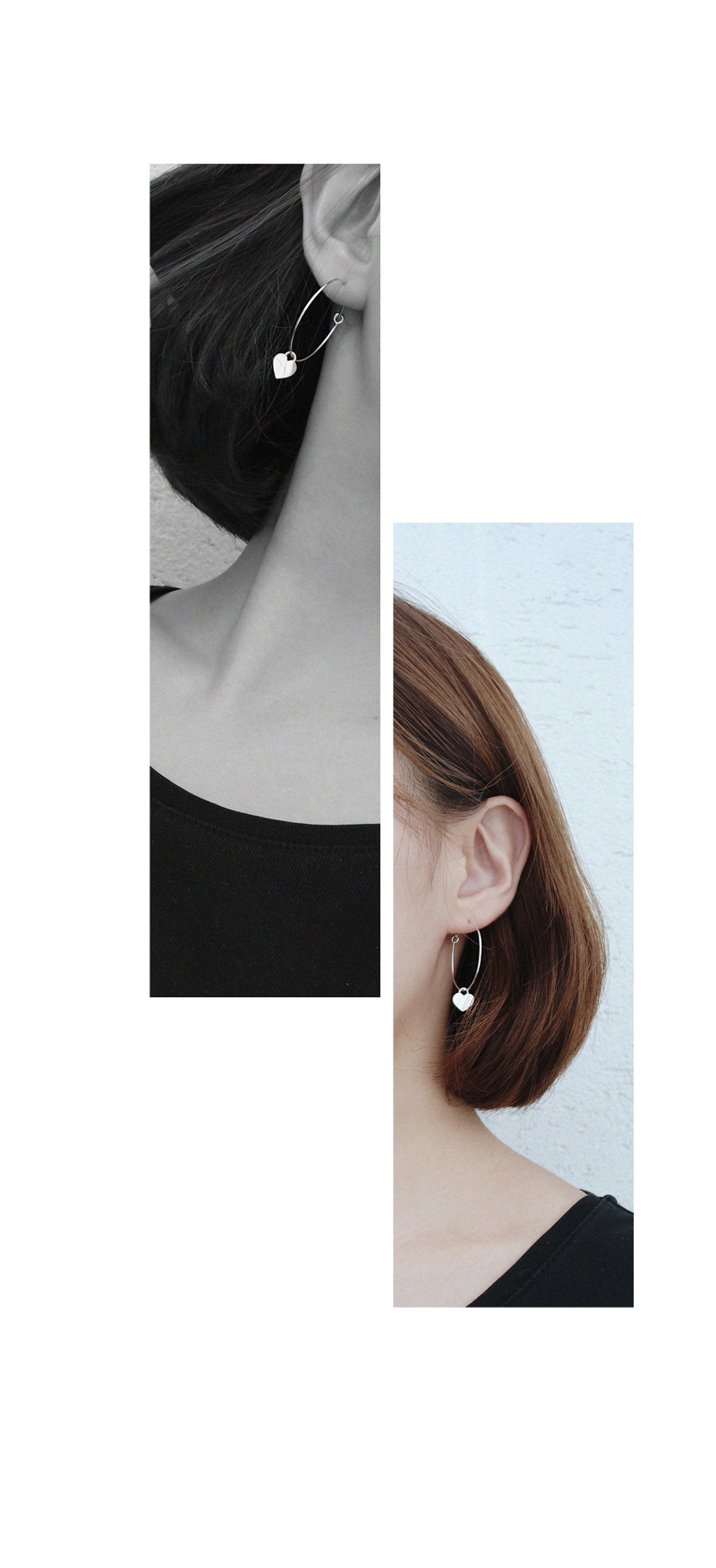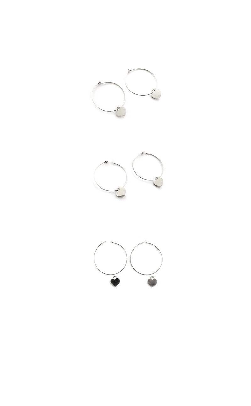 | hoop earring M size에 하트 팬던트를 매달은 이어링입니다. 움직임에 따라 자연스럽게 찰랑이는 하트가 매력적이에요. 하트 팬던트는 고정이 되어있지 않아서 분리가 가능합니다. 팬던트를 빼서 링만 착용하실 수 도 있습니다. 하나의 이어링으로 여러 연출이 가능해요. 착용했을 때 더 예쁘답니다. |info.| · material(재료):925 sterling silver · 하트 가로 * 세로 길이(오링포함):9mm * 10mm · 두께:1.5mm |