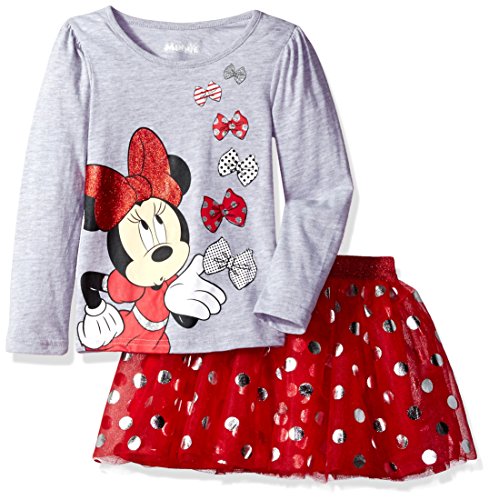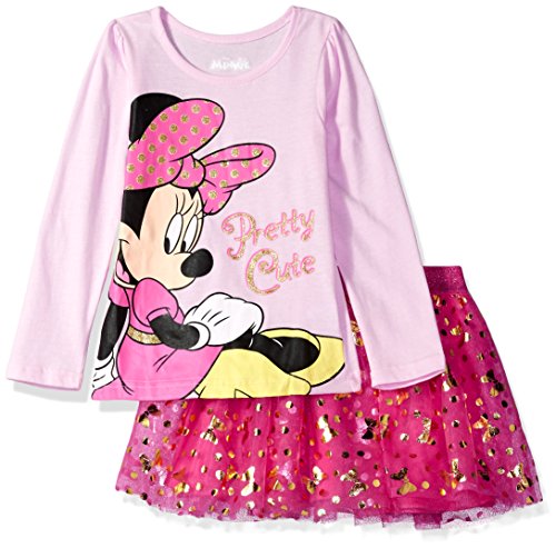 Disney minnie mouse character screen print long sleeve top with glitter accents and all over foil tricot mesh skirt