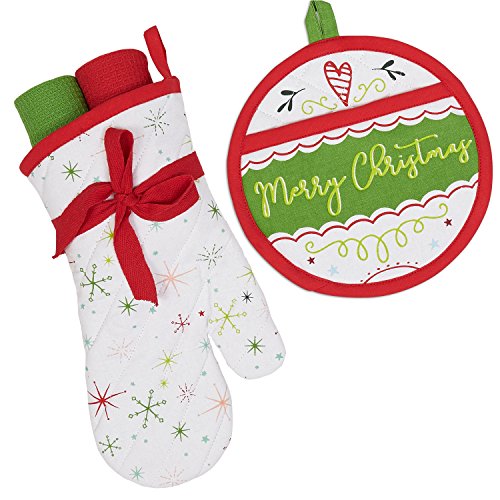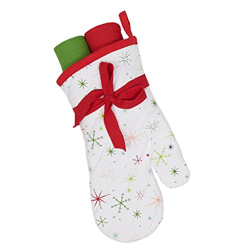 DII Cotton Christmas Holiday Oven Mitt and Dish Towels Gift Set, Perfect for Kitchen Cooking and Baking-Snowflake