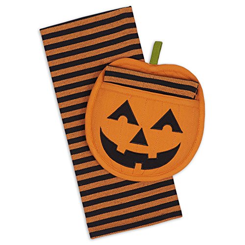 DII Cotton Haloween Holiday Dish Towel and Pot Holder Gift Set, Perfect for Kitchen Cooking and Baking-Jack O' Lantern