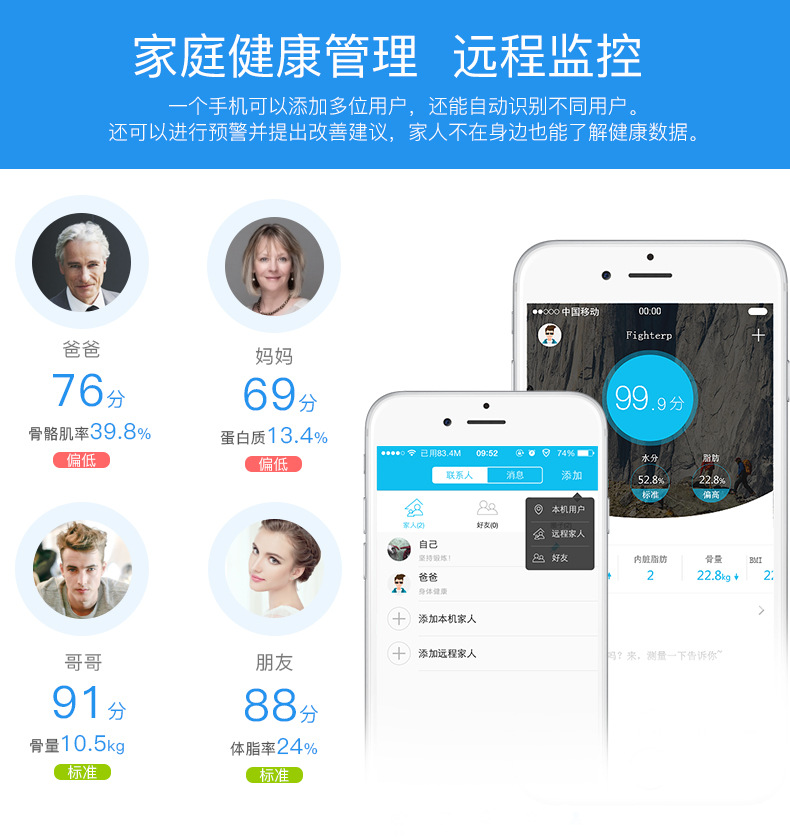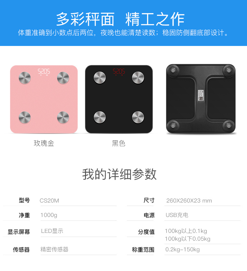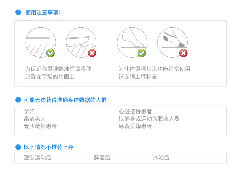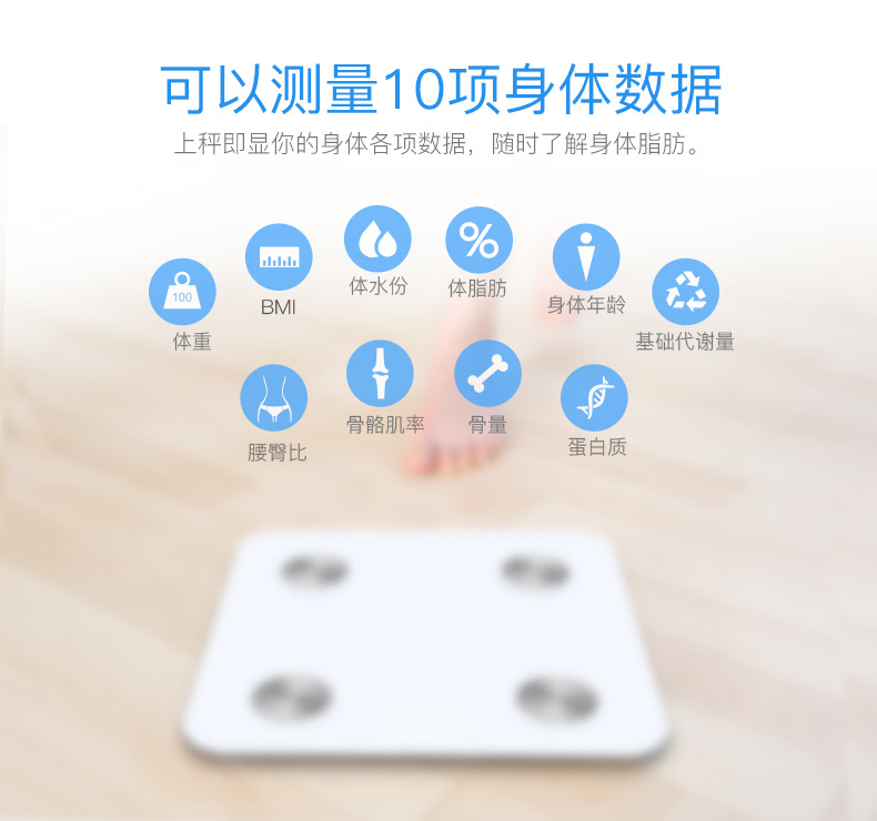 测量的数据跟环境及人体状况有较大关系。首先需要确保秤放在平稳而坚硬的地板,这样可以确保体重 测量是准确的,同时人体需要挺直站立,两只脚(赤脚)均匀的踩在电极上,测量的时候保持身体不要动。 因为人体一天中体重变化较大(因为饮食),但是脂肪组织并不会突变,因此脂肪率(脂肪重量/体重) 在一天中的测量数据会出现波动。所以尽量在每天同一时间同一条件下测量会更精确,测量时赤脚并尽 量穿轻薄衣服。