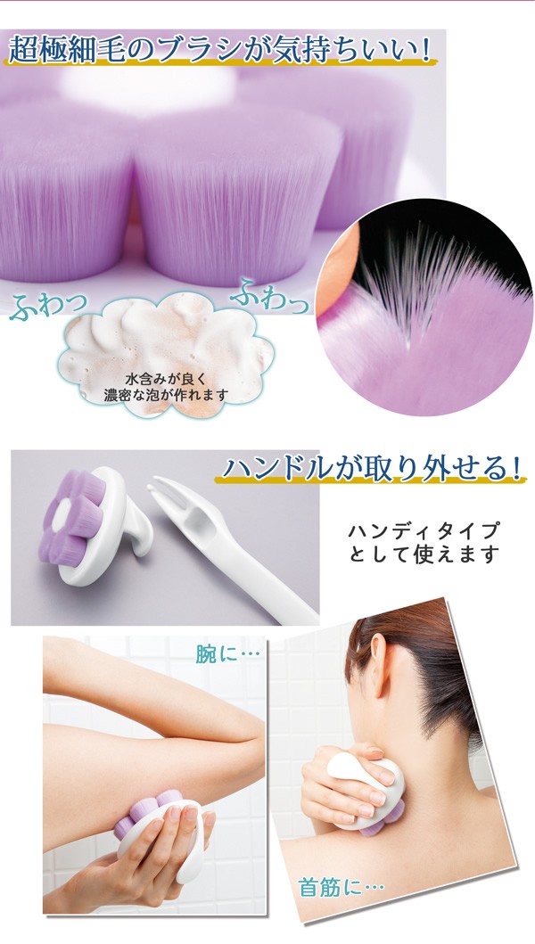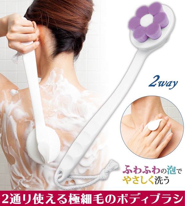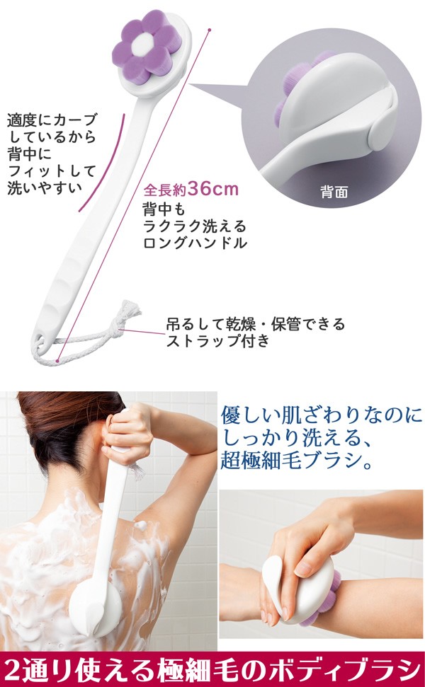 | 2通りで使える!極細毛のボディブラシ。超極細毛の柔らかいブラシは水含みが良く、濃密でふわふわな泡が作れます。ハンドルが取り外せてハンディタイプとしても使え、腕や首筋を洗う際に便利。全長約36cmのロングハンドルで適度にカーブしているから、洗いにくい背中にもラクラク届いてフィットして洗いやすい!2通り使える極細毛のボディブラシ/ボディたわし/やわらかい/曲柄/ロングタイプ/身体洗い/バスグッズ/お風呂/ |