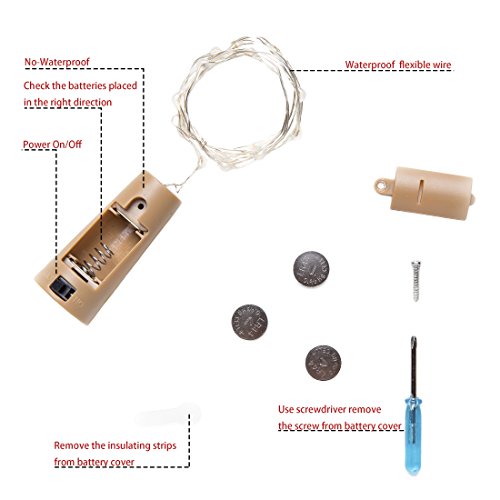 Easy to use: This LED cork light fits the neck of a variety of bottle sizes(Size of the cork -Shaped (TOP) is 0.59 inch to 0.9 inch,1.85 inch tall), all you have to do is just put the LED cork light in bottle and turn the switch on, then you will get a magic bottle light.You don’t need to drill holes in a bottle,and the batteries are easy to change.