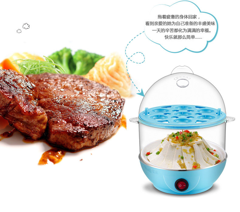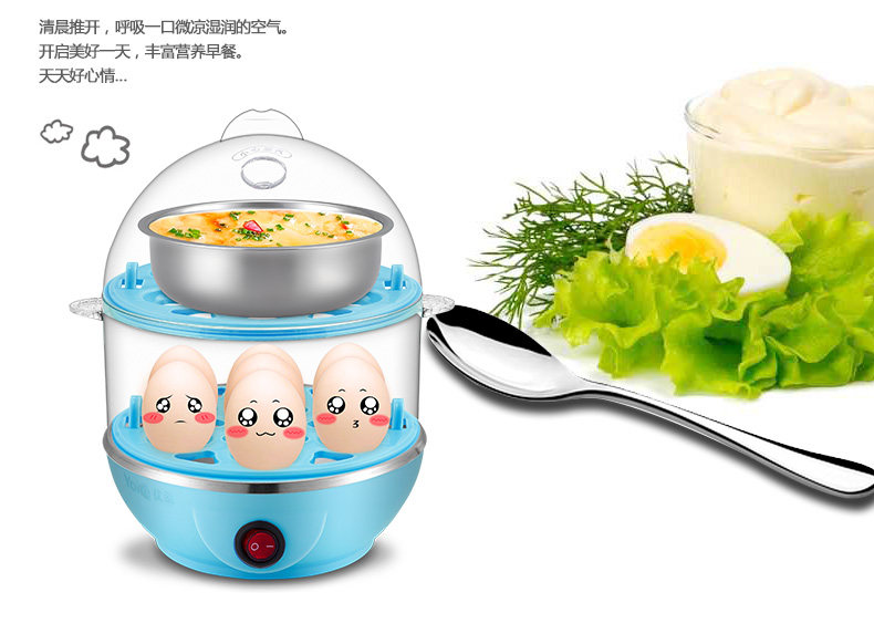 New 2015 Hot Multi-function Electric Egg Cooker Boiler blue Stainless steel Steamer Cooking Tools Kitchen Utensil Free shipping ZD01 Brand New Full Manufacturers Warranty Rise and shine to perfectly boiled or poached eggs, delicious omelettes or steamed veggies. Runny, soft or hard centered will be the only decision you need make. With non-stick coating, and a handy buzzer this compact egg cooker will be a hit in any kitchen. Features: Cooking rack holds and cooks up to 14?eggs in one sitting Poaches 2 eggs to perfection Steaming rack is ideal for steaming a variety of vegetables Convenient piercing pin on mesauring cup Non-stick interior for easy cleaning Ready buzzer