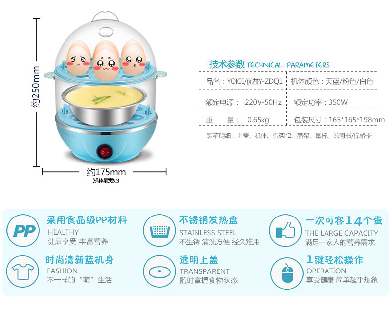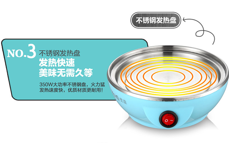 1、不锈钢发热盘:加热面积大,升温迅速,快速煮蛋结实耐用