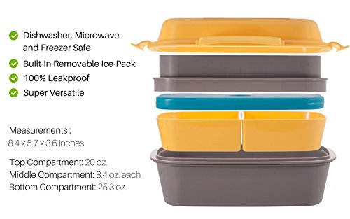 4 removable compartments portioned not too big, not too small, for a hearty and healthy lunch, for kids and adults alike. Built in removable cooling gel pack ensures your food stays cool and fresh all day on the go.