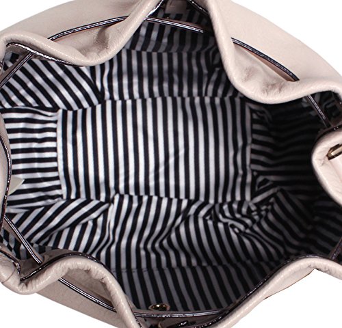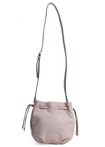 Kate Spade handbag, adjustable crossbody bag with drawstring closure, interior side zip and slide pockets, kate spade new york gold embossed signature with stud, cow leather with soft body and natural finish and matching trim, 14-karat light gold plated hardware, custom woven bookstripe printed on poly twill lining.Feature