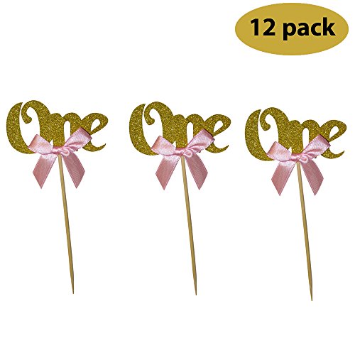 Glitter Gold 1st Birthday Party Decoration. One Cupcake Cake Topper With Pink Bow 12CT. …
