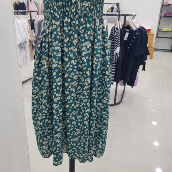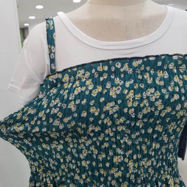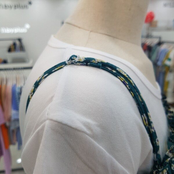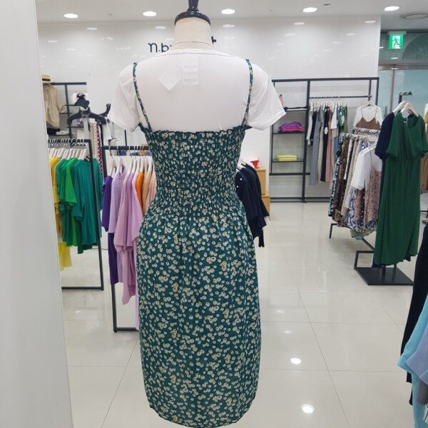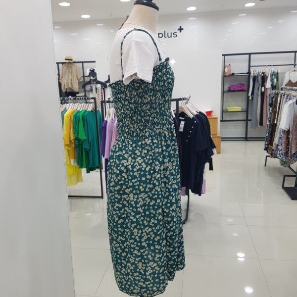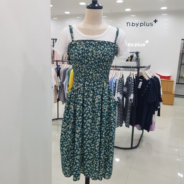 상반신 부분에 전체적으로 주름이 들어가 있어 신축성이 좋아 편하게 입기 좋은 원피스입니다.어깨끈은 길이 조절이 가능해요.함께 코디된 면티와 세트 상품입니다.