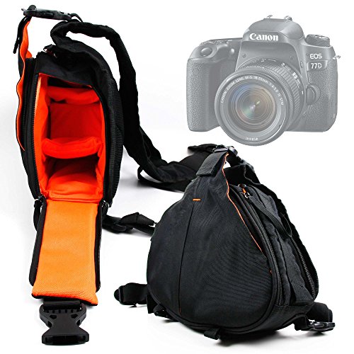 -. Title : Deluxe Triangle 'Sling' Carry Bag In Black & Orange Compatible with EOS Canon 77D Camera - by DURAGADGET
