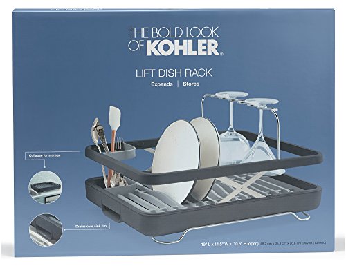 Studio : KOHLER Publisher : KOHLER Binding : Tools Home Improvement Product Description This dish rack is large enough to hold the big items that don’t go in the dishwasher and collapses so it can be easily stored in a cabinet.?The open design accommodates a wide range of items, from your largest pans to delicate wine glasses. A collapsible utensil rack and folding wine rack make space for larger items. The rim collapses at the push of a button so the rack can be easily stored away when not in use. 0