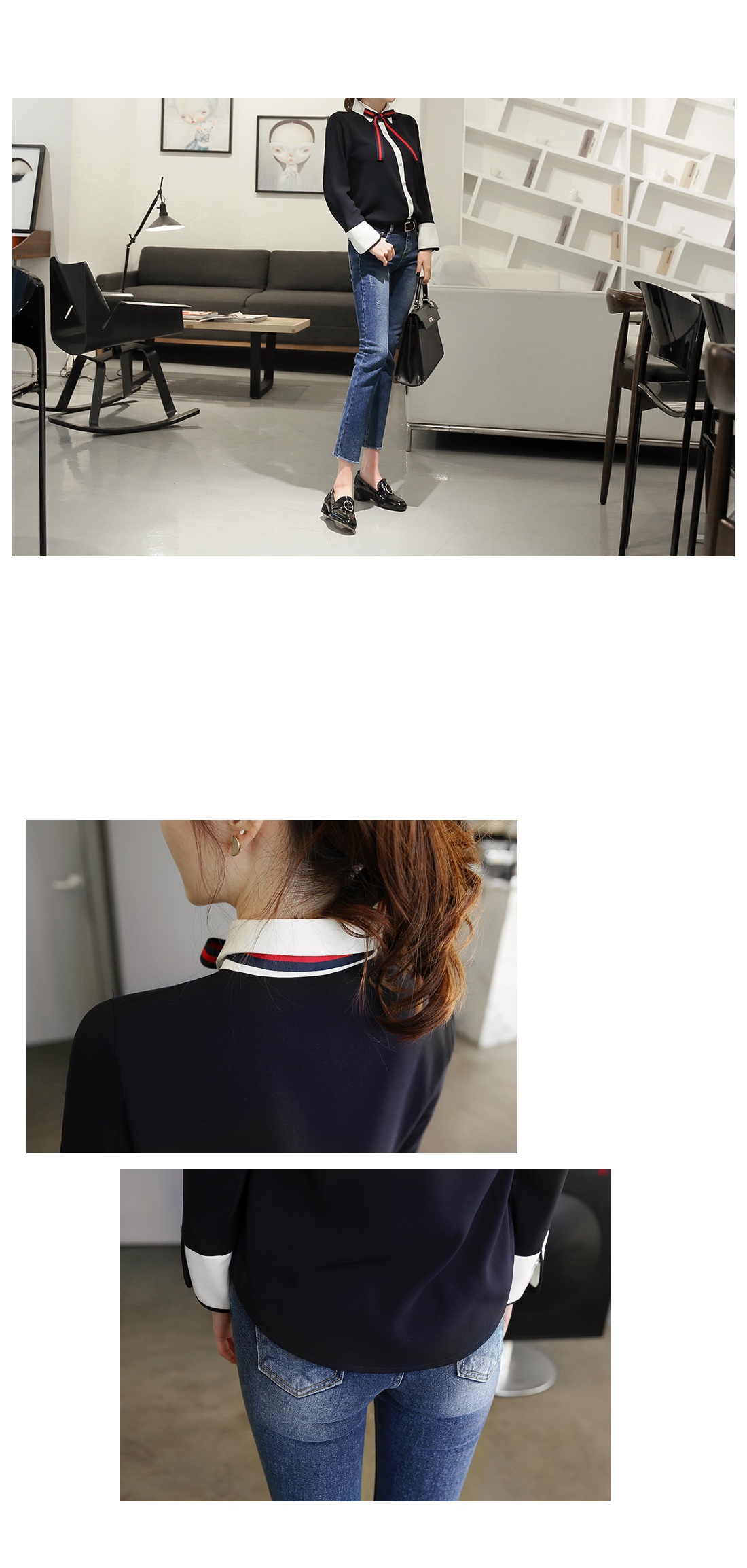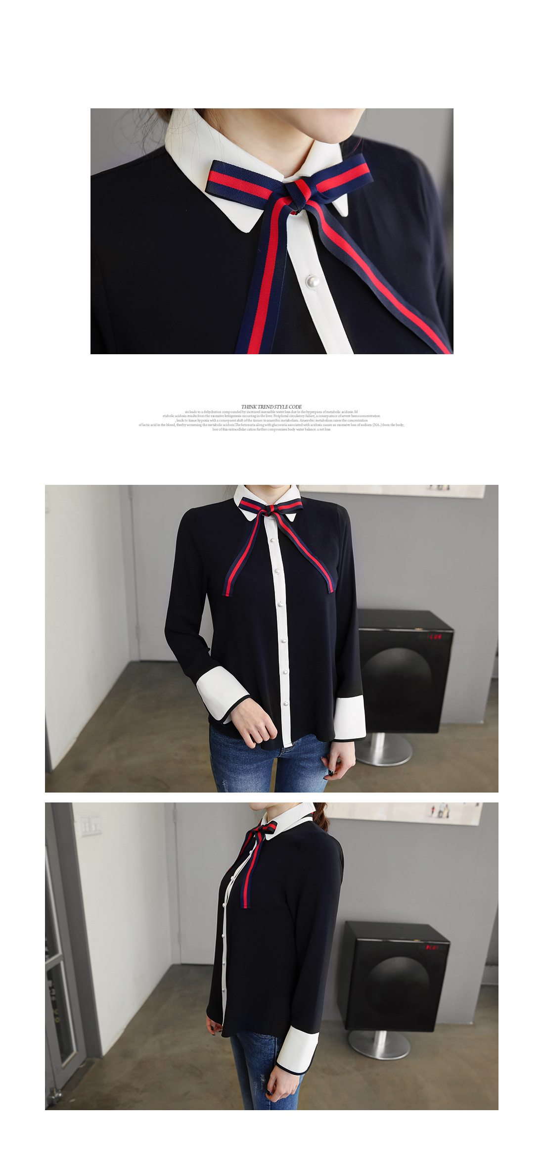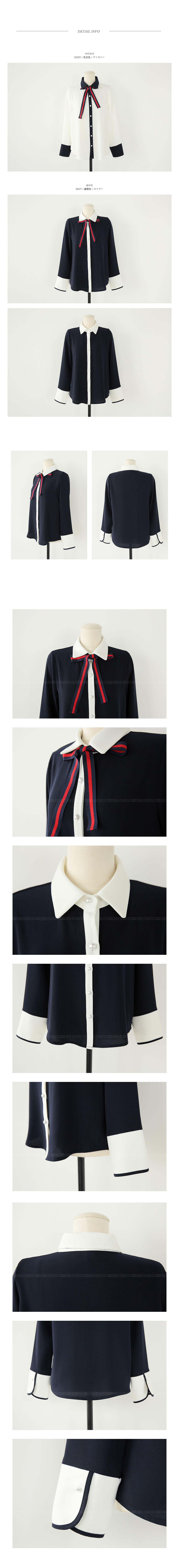 다양한 느낌으로 즐기기 좋은리본타이 블라우스에요!하늘한 쉬폰소재감이 여성스러운무드를 연출해 주는 블라우스구요버튼이 진주로 포인트를 주어한층 더 여성스러운 매력을 어필해요~리본타이가 세트로 구성되어다양한 느낌으로도 연출이 가능하구요배색컬러로 한번 더 포인트를 주어세련된 룩을 완성해준 블라우스랍니다^^팬츠,스커트 등 어디에 매치해도스타일리시한 아이템이에요!