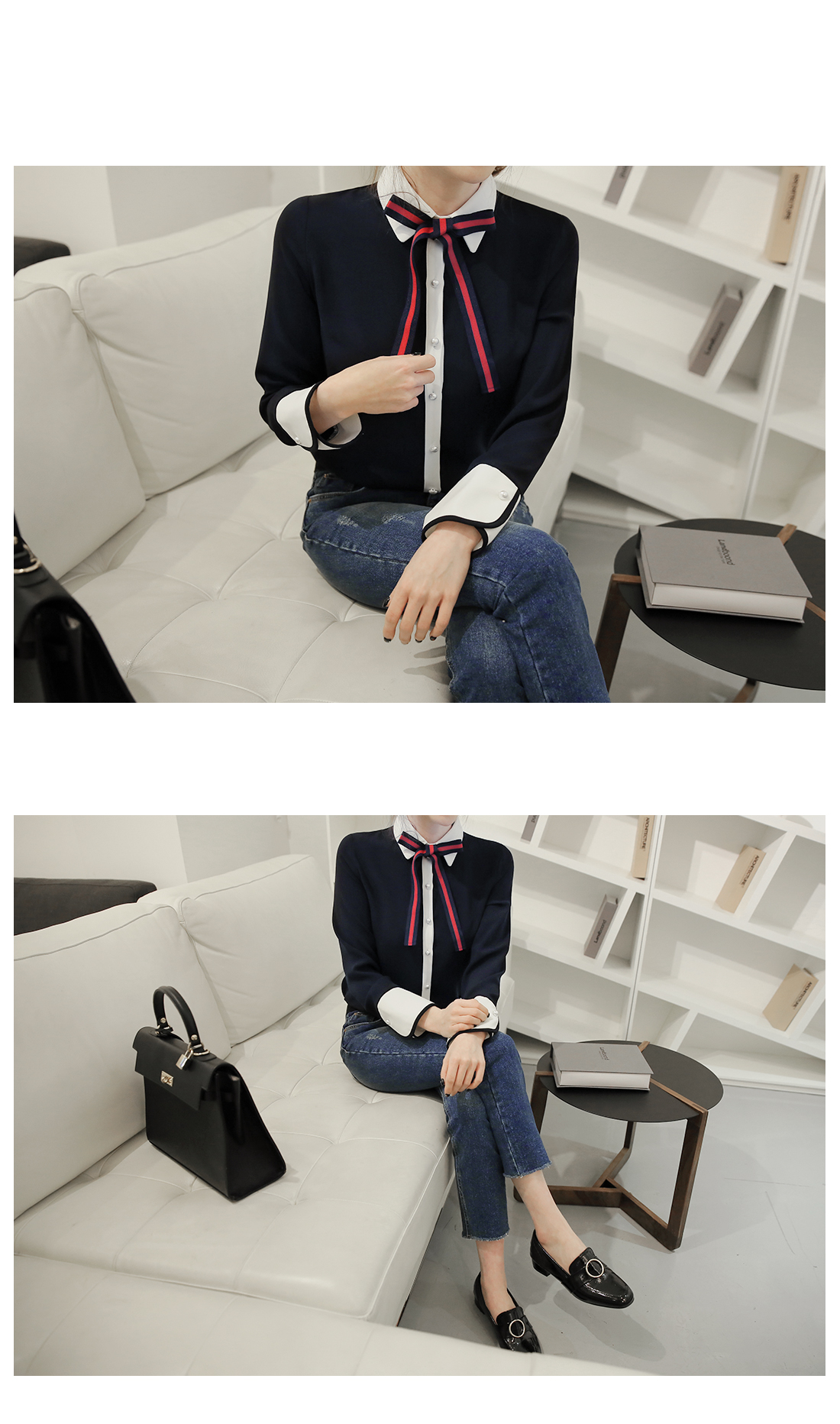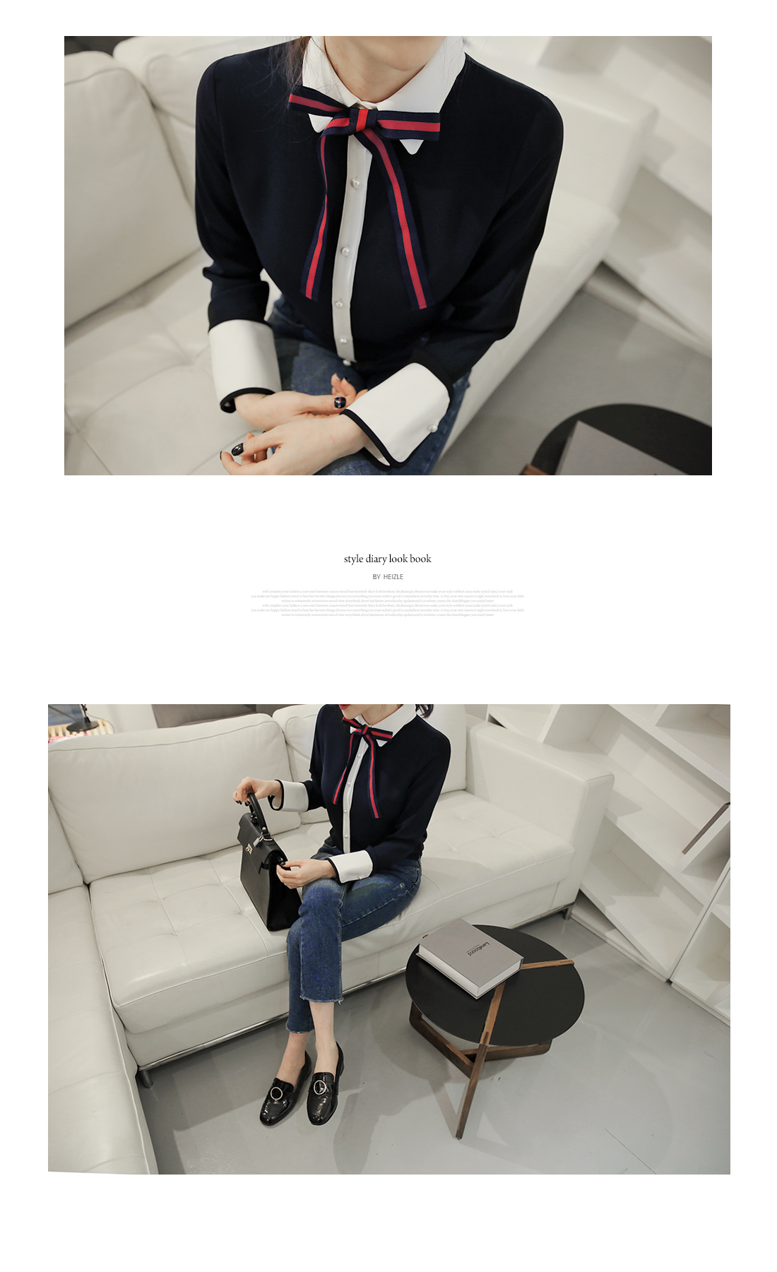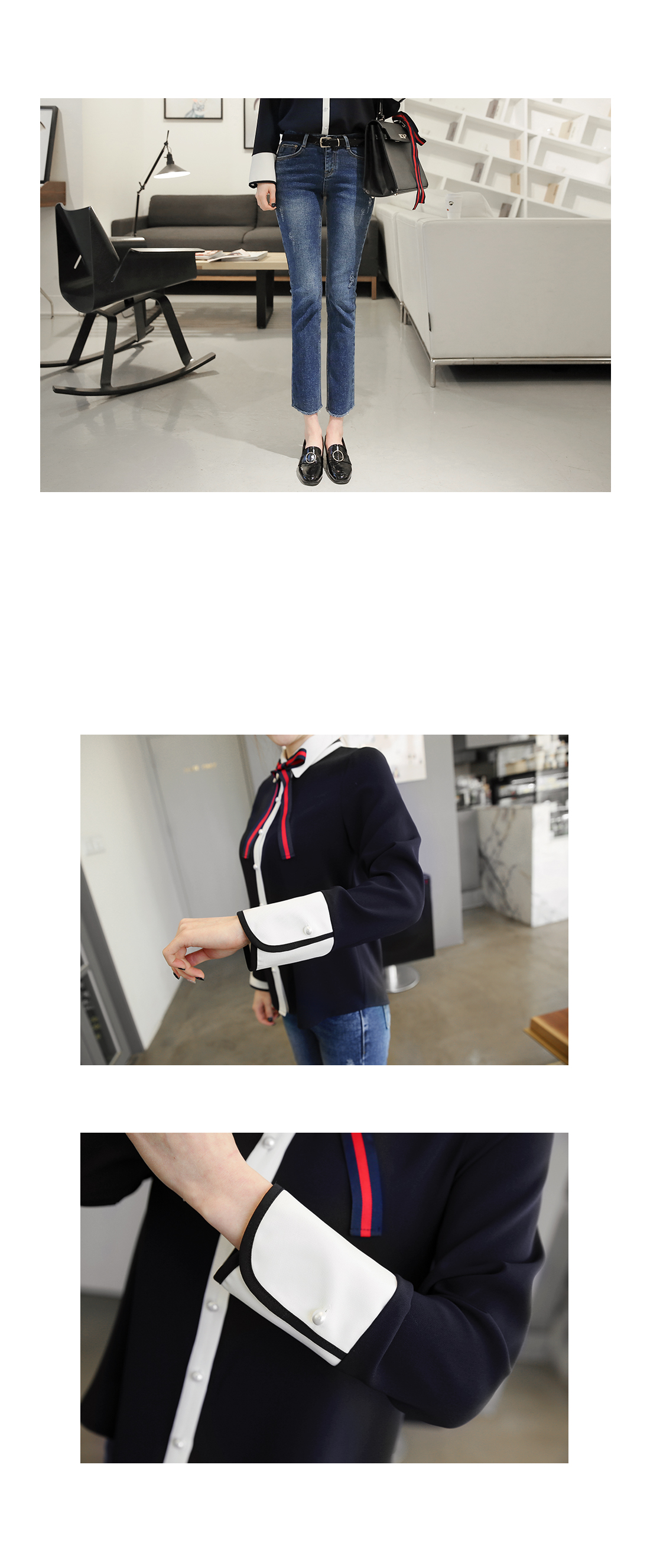 다양한 느낌으로 즐기기 좋은리본타이 블라우스에요!하늘한 쉬폰소재감이 여성스러운무드를 연출해 주는 블라우스구요버튼이 진주로 포인트를 주어한층 더 여성스러운 매력을 어필해요~리본타이가 세트로 구성되어다양한 느낌으로도 연출이 가능하구요배색컬러로 한번 더 포인트를 주어세련된 룩을 완성해준 블라우스랍니다^^팬츠,스커트 등 어디에 매치해도스타일리시한 아이템이에요!