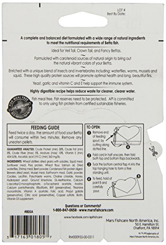 A complete and balanced diet, specially formulated to meet the nutritional needs of Bettas. Brings out the Betta's natural, vibrant colors. Protein-rich formula promotes the growth of long, beautiful fins.Feature