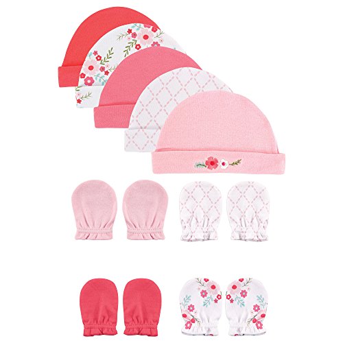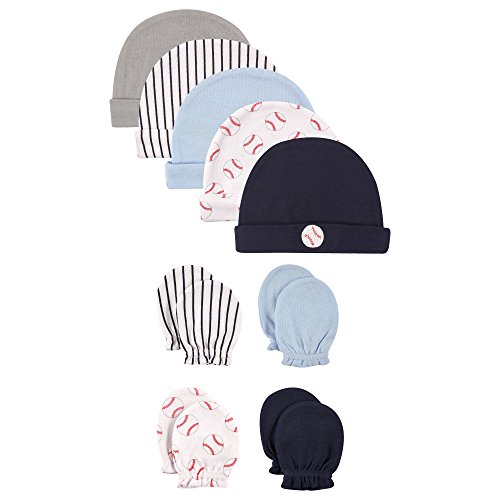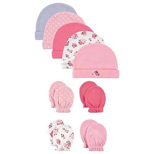 Product Description Luvable Friends 5 caps and 4 pack scratch mittens sets are the perfect way to keep your baby covered and avoid scratching. All caps and scratch mittens are 100 percent combed cotton and soft on baby's gentle skin. 0