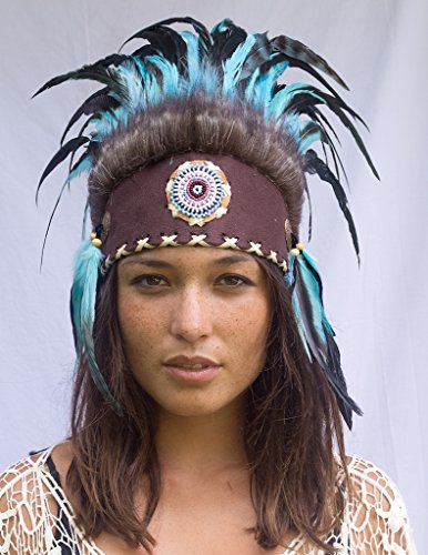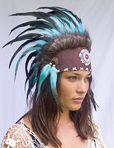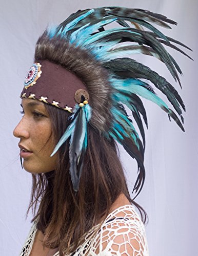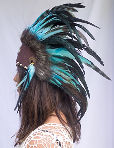 - Title : Small Unique Indian Headdress - Native American Chief Headdress Handmade by Artisan Halloween Costume or Prop for Photo Shoot for Men Women or Children with Real Feathers - Turquoise with beads