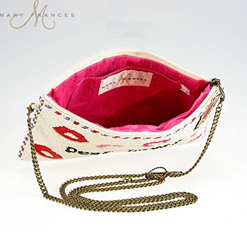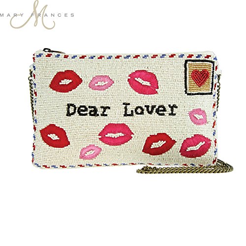 Studio : Mary Frances Publisher : Mary Frances Product Description Stow all of your essentials in one chic package, sealed with a kiss! The handcrafted artistry of designer Mary Frances brings us the beautifully decorated 'Sealed with a kiss' handbag. Pucker up to the meticulous beadwork addressed for "Dear Lover" and adorned with fabric kisses. The metallic beaded heart sends this clutch out for the night. The zip top closure includes a detachable chain strap, offering a crossbody carry. The interior is lined in a smooth, bright fabric with a slip pocket, and easily accommodates your phone, keys, and cash. Detachable Strap Drop: 23". Dimensions: 9"W x 0.5"D x 5.5"H. Weight: .7 lb. Made in India. 0